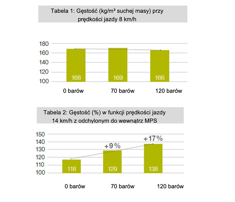 Co ciekawe, przy niskich prędkościach (8 km/h) nie zaobserwowano efektu MPS – gęstość balotu pozostała na stałym poziomie. Gęstość balotu w odniesieniu do świeżej masy była identyczna. Na poziomie suchej masy w przypadku ciśnienia prasowania wynoszącego 180 barów zanotowano gęstość o 28 kg/m³ wyższą (z 168 na 196 kg/m³ suchej masy) w porównaniu z ciśnieniem 130 barów. W obu seriach testowych przy prędkości 8 km/h MPS nie miał jednak wpływu na ciężar balotu i tym samym na jego jakość.