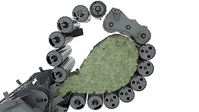 MPS to skrót od MAXIMUM PRESSURE SYSTEM (z ang. system maksymalnego ciśnienia lub system maksymalnego nacisku). „Chodzi tu o umieszczony w tylnej pokrywie pras ROLLANT uchylny segment trzech walców, który wywiera dodatkowy nacisk na balot” – wyjaśnia Hendrik Henselmeyer, Manager CLAAS ds. Produktu – Prasy. W momencie rozpoczęcia formowania balotu trzy walce MPS wchodzą do wnętrza komory prasującej. Następnie coraz większy balot przyciska je ku górze w położenie krańcowe. Dzięki temu balot obraca się od samego początku i jest zagęszczany już od średnicy 90 cm. W ten sposób powstaje wysoko zagęszczony balot – nawet przy wysokiej prędkości jazdy” – dodaje Hanselmeyer.